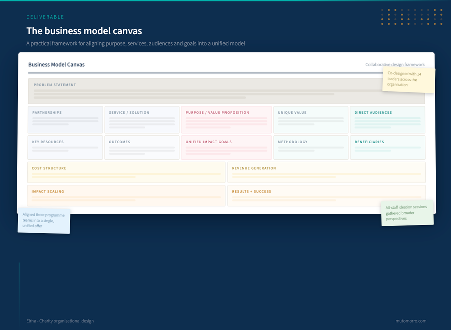 None of this was designed in isolation. Fourteen staff members contributed directly to the business model design work, exploring questions about purpose, audiences, service offerings, and how Elrha creates value. Ideation sessions brought the whole team together to shape proposals before they were finalised. The future wasn't handed down - it was built with the people who would live with it.