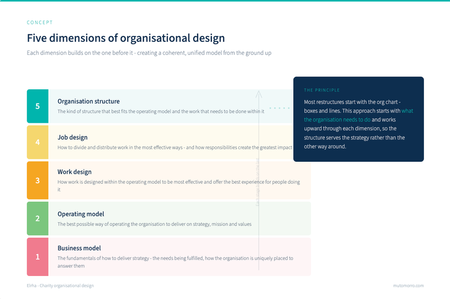 Elrha wanted to move from a structure that had grown organically into one that was intentionally designed. The goal was to create a unified operating model - connecting strategy implementation, structure, and ways of working so that everything pulled in the same direction.