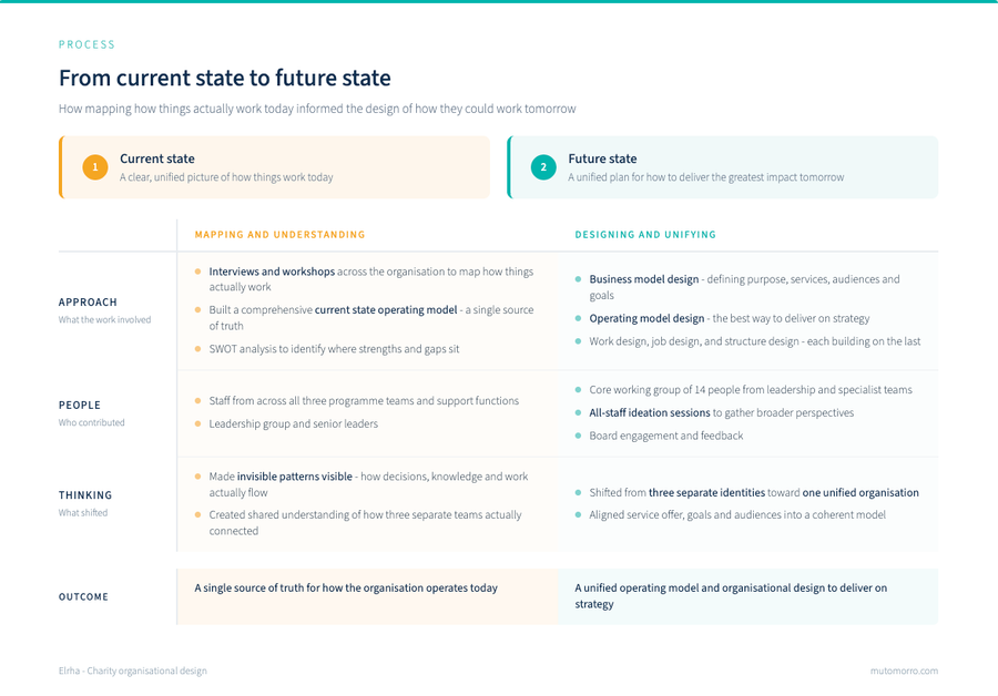 The work began by mapping how Elrha actually operated - not what the org chart said, but how decisions really got made, how information flowed between teams, and where energy was being absorbed by disconnected ways of working. This created a single source of truth about the current state - something that hadn't existed before. For the leadership team, this was invaluable. You can't map the journey to where you want to be if you don't have a clear, shared picture of where you are.