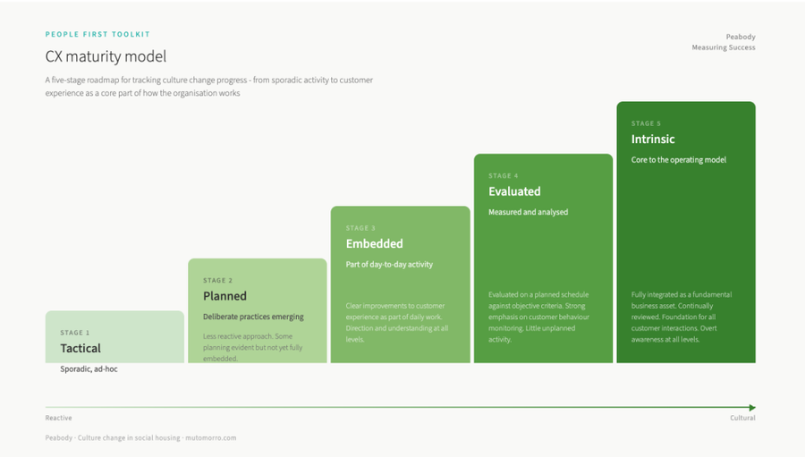 The programme moved from being externally supported to internally owned - with champions and the L&D team running sessions, managers using the toolkit in their teams, and leadership modelling the approach. A monthly Pulse Check gave teams a simple diagnostic across eight areas of culture change - from enabling environment and innovation to cross-team collaboration and customer focus - with a traffic light system to prioritise where to act. A CX Maturity Model mapped the journey from tactical, sporadic activity through to customer experience as something intrinsic to how the organisation works. Culture change in social housing became self-sustaining rather than consultant-dependent.