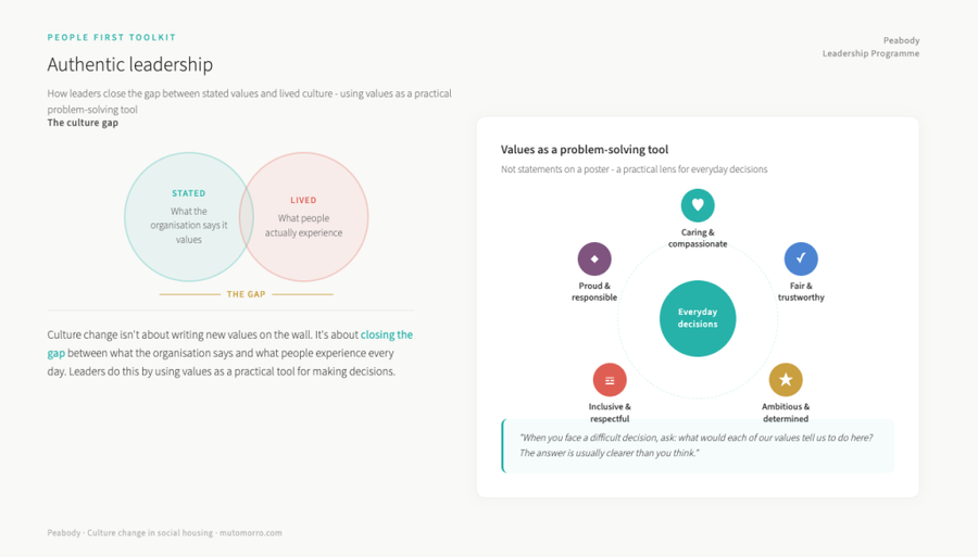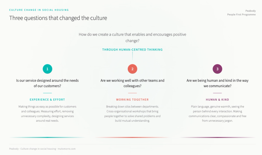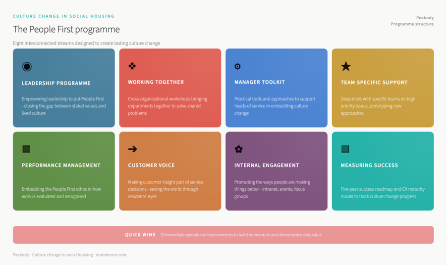 These questions became the foundation for "People First" - Peabody's culture change programme. Each question led to a distinct strand of practical work that together shaped culture change in social housing across the merged organisation.