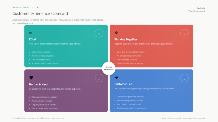 To support culture change in social housing at the team level, managers needed practical tools - not just principles. Although a question like "Is our service designed around the needs of our customers?" sounds simple, it actually involves a huge amount of work. It means listening to and genuinely understanding customers, knowing how to map service journeys, and running sessions with teams to find better ways of delivering.