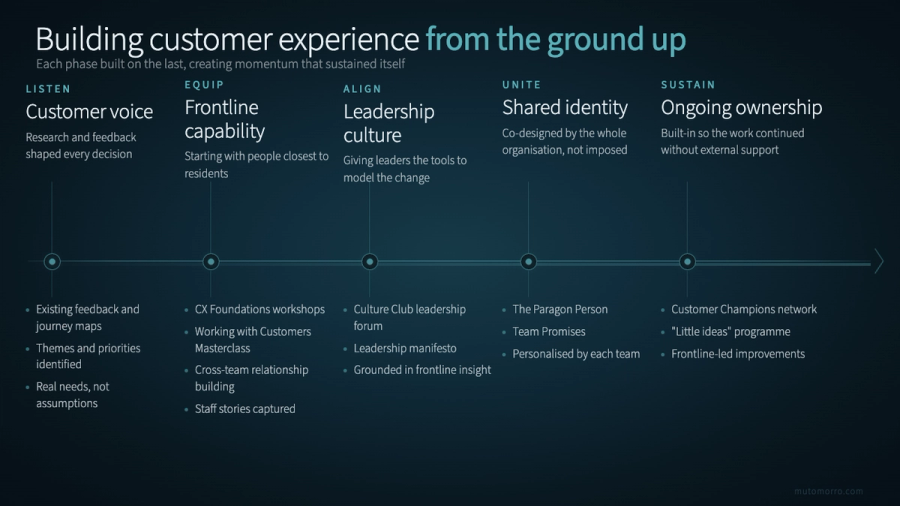 That meant several things needed to happen together. A shared customer-centric vision that everyone understood and owned. Leadership that actively modelled and supported the new culture. Practical customer service skills so teams could handle interactions better. Ways for teams to take ownership of their part of the customer experience. And mechanisms for continuous improvement so the work didn't stall once the initial energy faded.