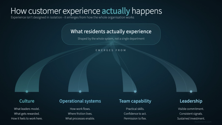 This project revealed something that became central to our understanding of organisational change: customer experience in social housing is an emergent property of the whole organisational system. It emerges from how teams work together, what leaders model, whether frontline staff feel empowered, how knowledge flows between departments and whether the culture genuinely supports putting residents first. You can't install good customer experience through a technology procurement. You have to cultivate it through the way people work.