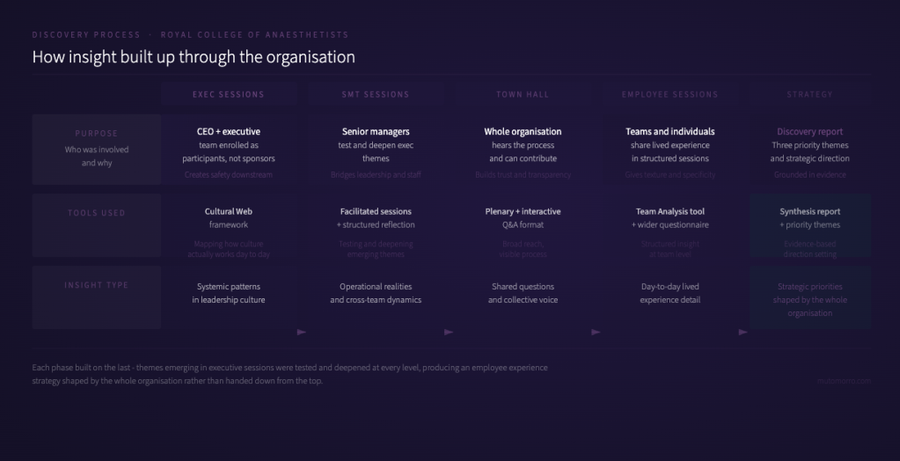 Each layer built on the last. Themes that emerged in exec sessions were tested and deepened with the SMT. Employee conversations gave texture and specificity to what had previously been more general. The result was a picture of working culture that had been shaped by the whole organisation, not constructed by a few voices at the top - exactly the kind of foundation a credible employee experience strategy requires.