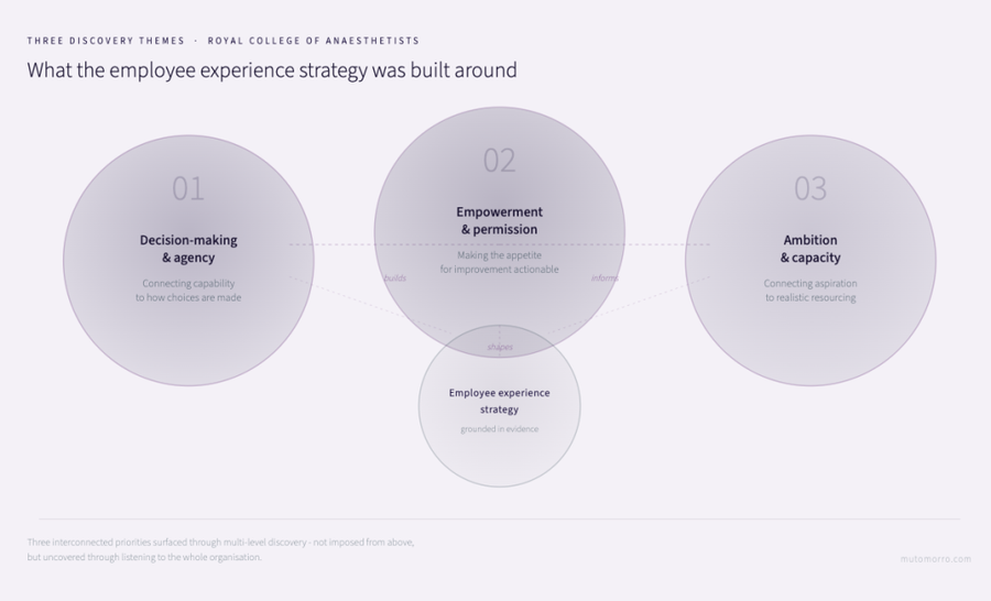 The discovery surfaced three interconnected themes - not as problems to solve, but as clear opportunities for the College to invest in as it developed its employee experience strategy.