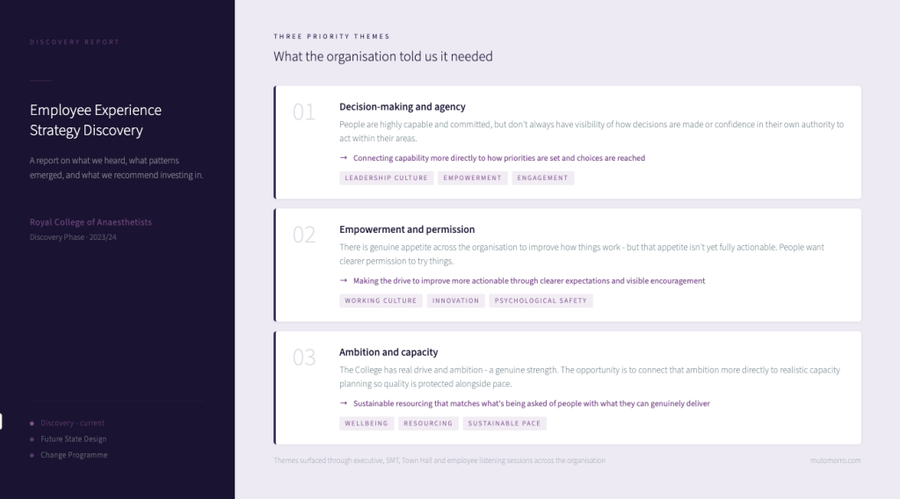 The discovery phase concluded with a detailed report that brought together the themes, the evidence behind them, and clear priorities for the College to carry forward. Senior leaders used this as the basis for a longer-term programme of investment in employee experience and working culture - knowing the direction had been shaped by the whole organisation, not handed down from the top.