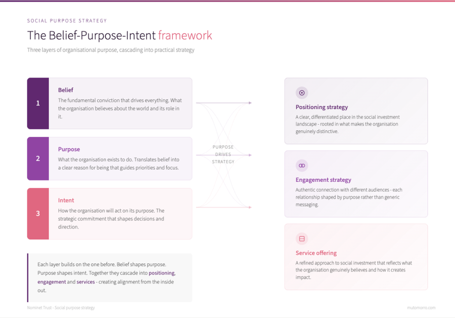 This is a different kind of social purpose strategy. It doesn't bolt purpose onto an existing business model. It starts with belief and builds outward - through organisational purpose, into positioning strategy, engagement strategy and service offering. Purpose doesn't sit alongside the strategy. Purpose is the strategy.
