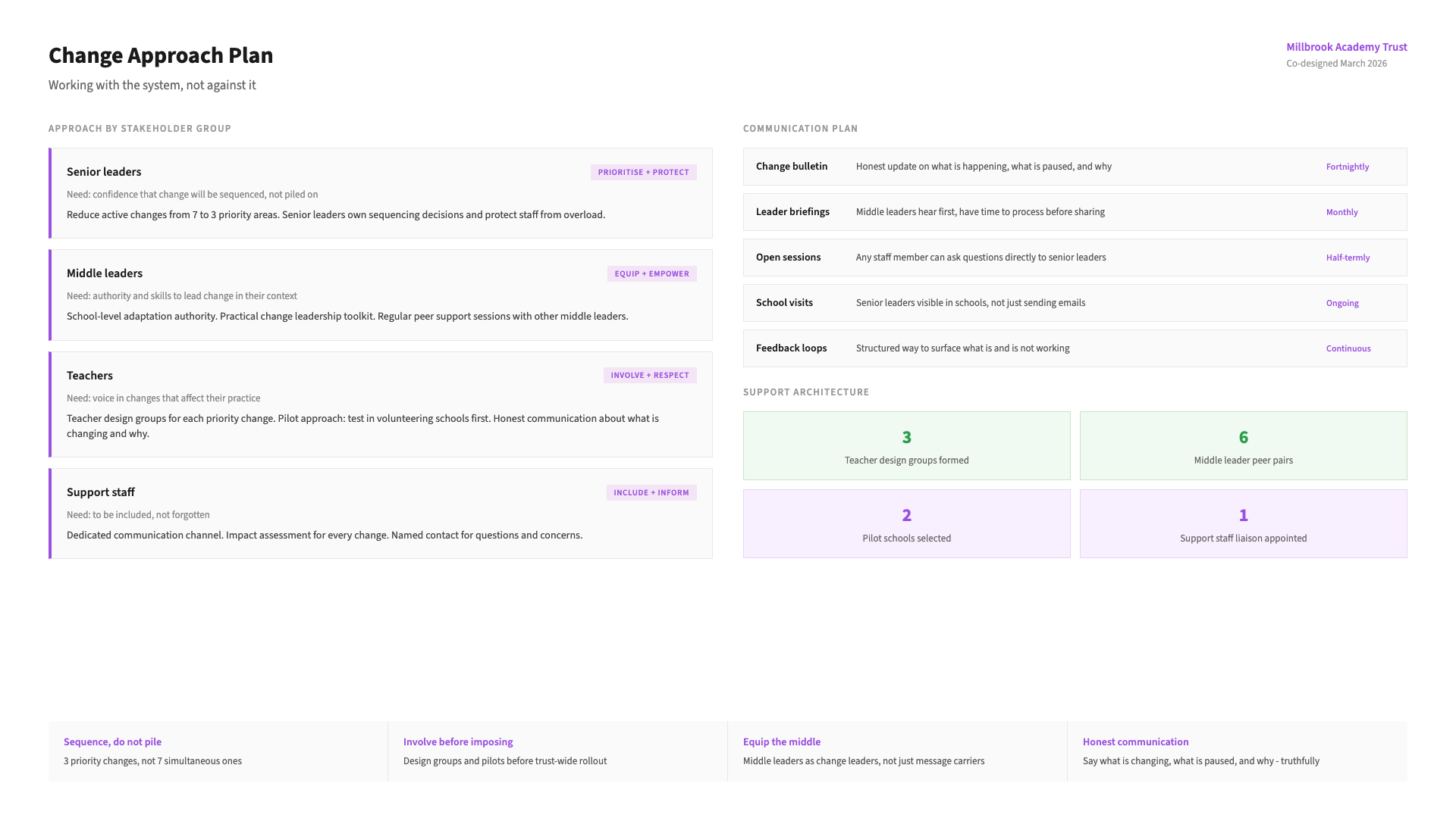 A change approach designed with the people who will make it work - practical, context-specific, and owned by the organisation rather than imposed on it.