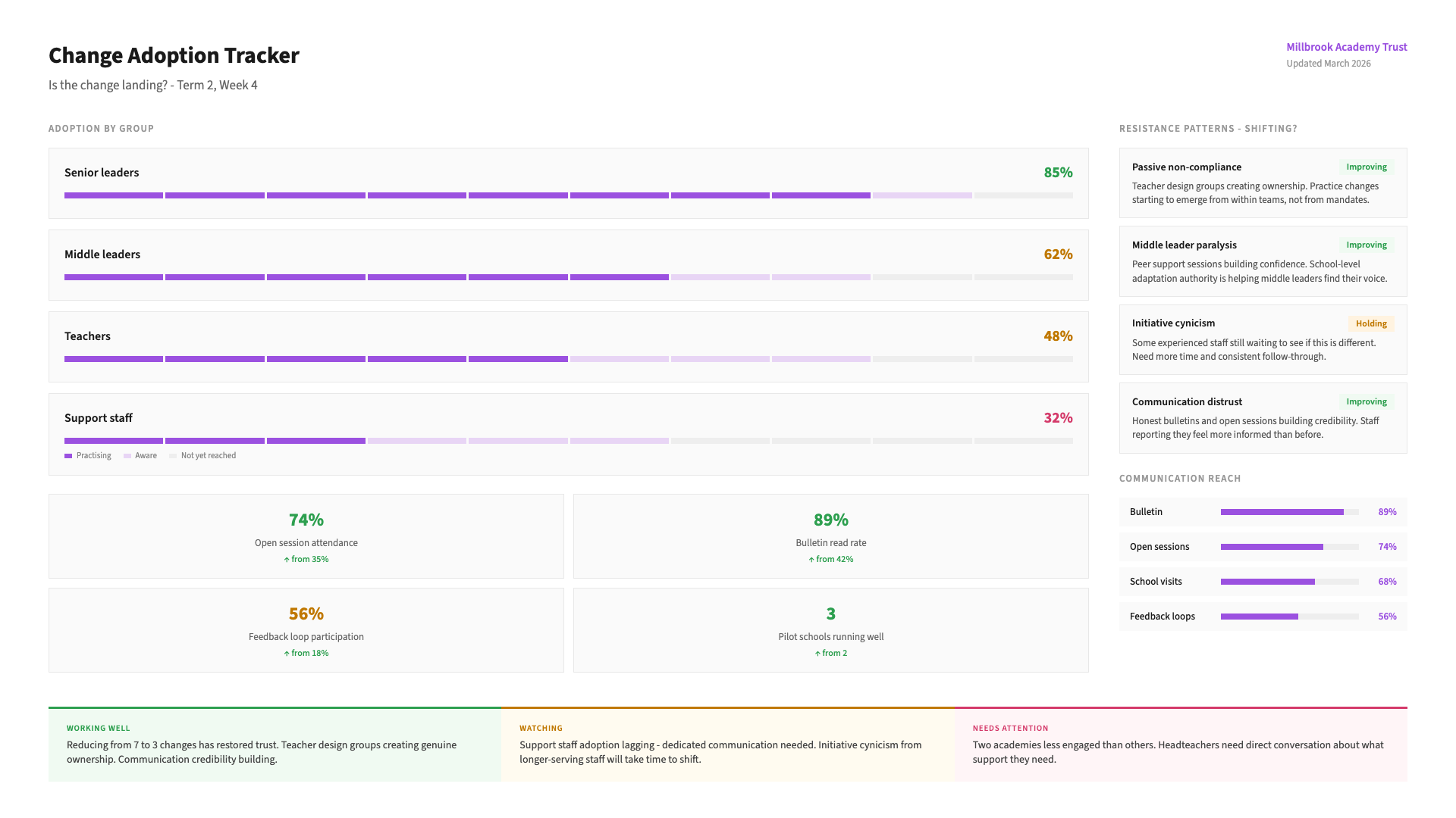 - Designing change approaches that account for how the organisation actually works, not how it is supposed to work