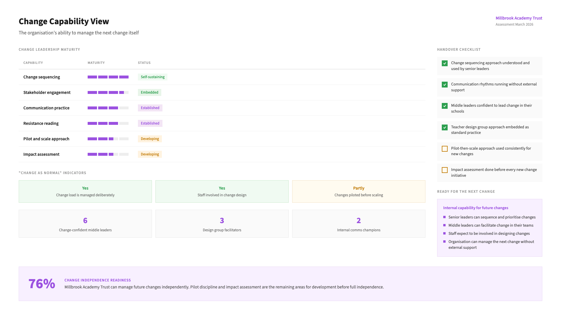 Change that lands in practice, not just in theory - supported through the reality of implementation, not abandoned to it.