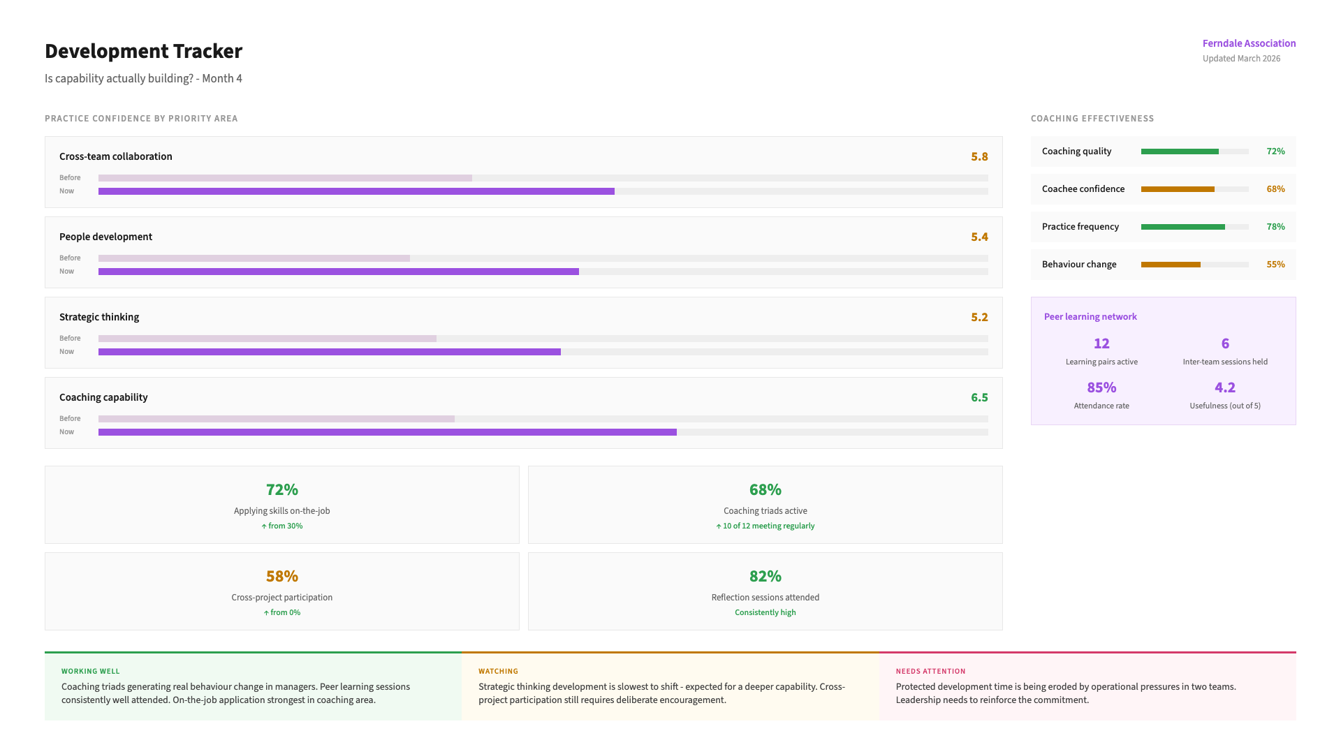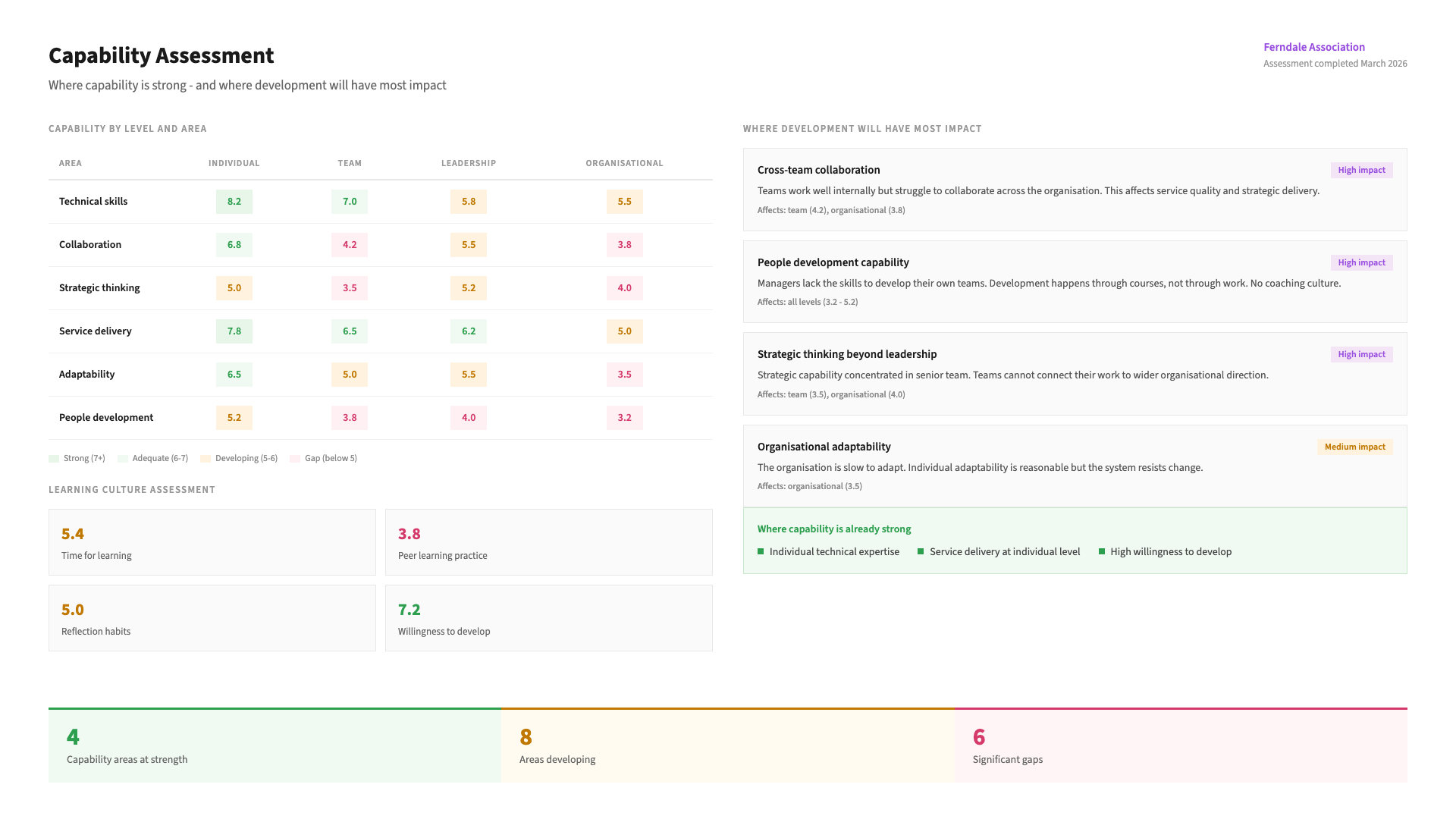 A clear picture of organisational capacity - what is strong, what needs developing, and where the systemic conditions need to change to support growth.