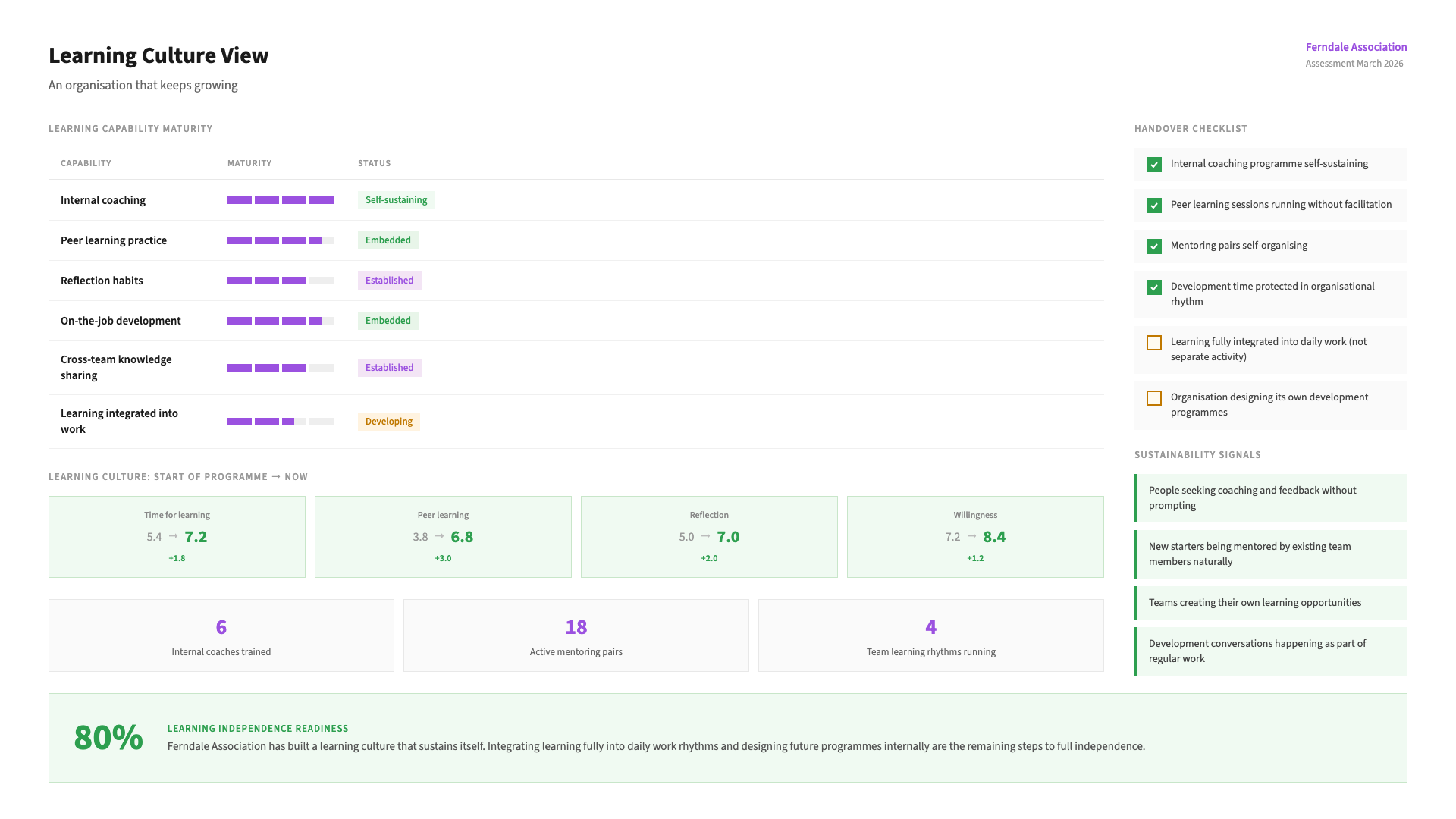 The ultimate goal of organisational capacity building is an organisation that keeps developing its own capability as a normal part of how it works. Not dependent on external programmes. Not waiting for the next training budget cycle. An organisation where learning, development, and growth are part of the culture.