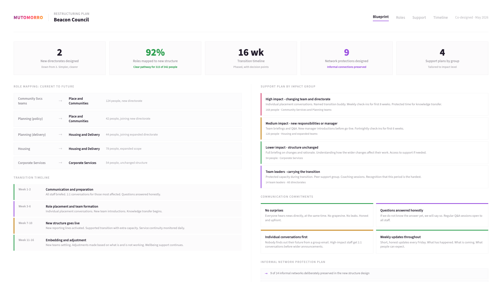 - Supporting leaders to communicate the rationale, the process, and what it means for people - honestly and consistently