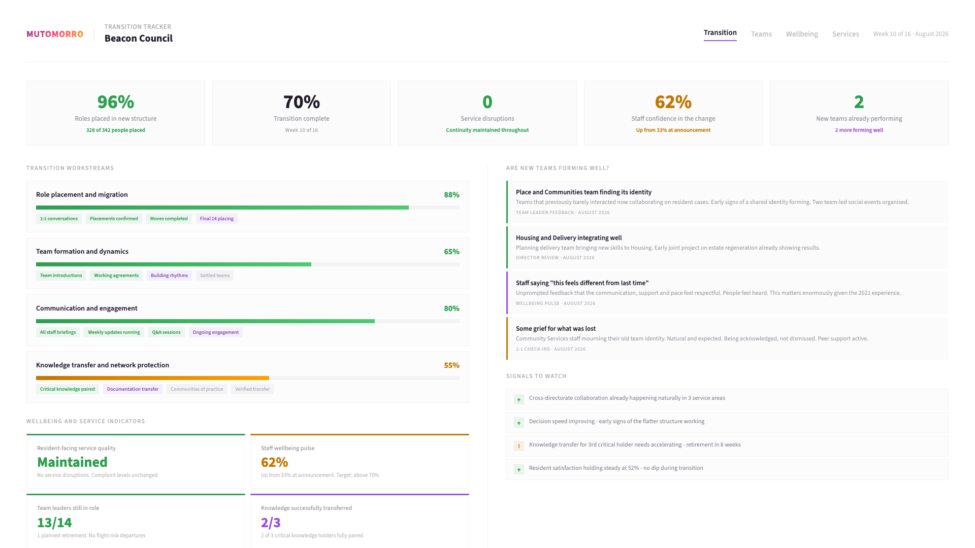 We support the transition over time, helping leaders communicate clearly, helping teams form and find their rhythm, and helping the organisation navigate the inevitable bumps that come with significant structural change.