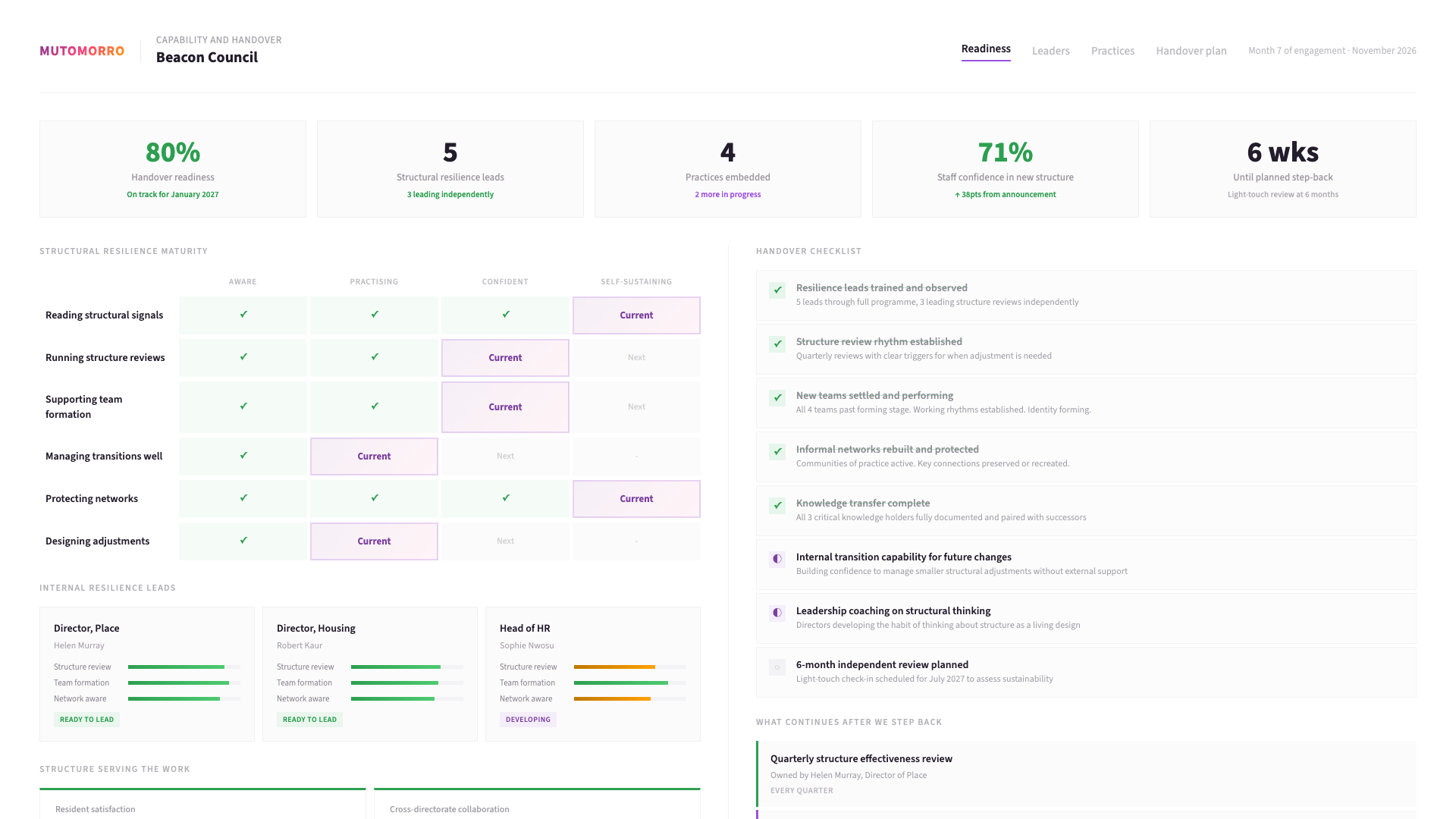 The best structures are not static. They evolve as the organisation learns, grows, and adapts. Our goal is to leave you with the capability to keep developing how your organisation is designed - adjusting, refining, and improving as needs change.