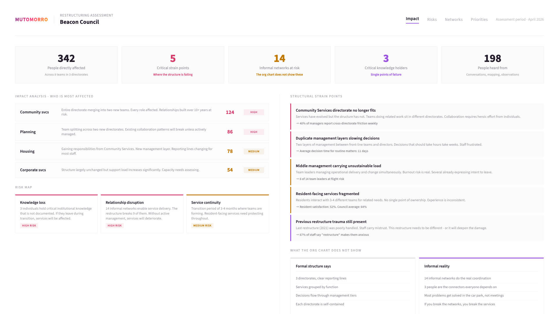 An organisational restructure changes the shape of the organisation. But it also changes how decisions flow, how teams collaborate, how knowledge moves, and how people experience their working lives. A restructure that only considers reporting lines and headcount misses most of what actually matters.