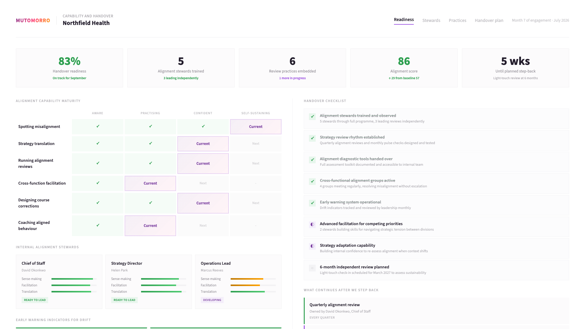 Alignment is not a destination. As the organisation grows and the context changes, new misalignments will emerge. The goal is to build the internal capability to notice, diagnose, and address misalignment as an ongoing practice - not something that requires a consultancy every time.