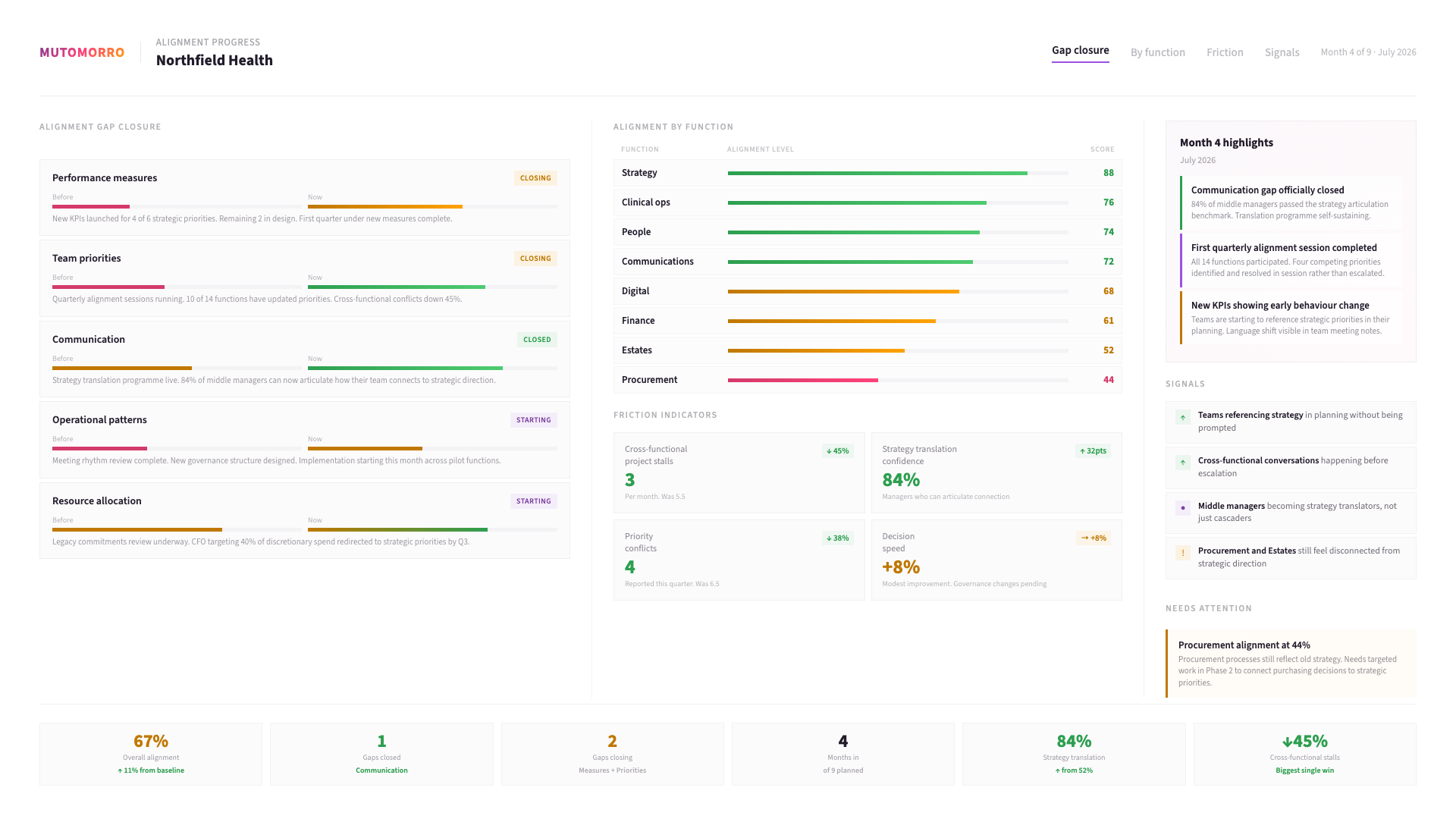 A clear map of where the organisation is and is not aligned with its strategy - with agreed priorities for where to focus.