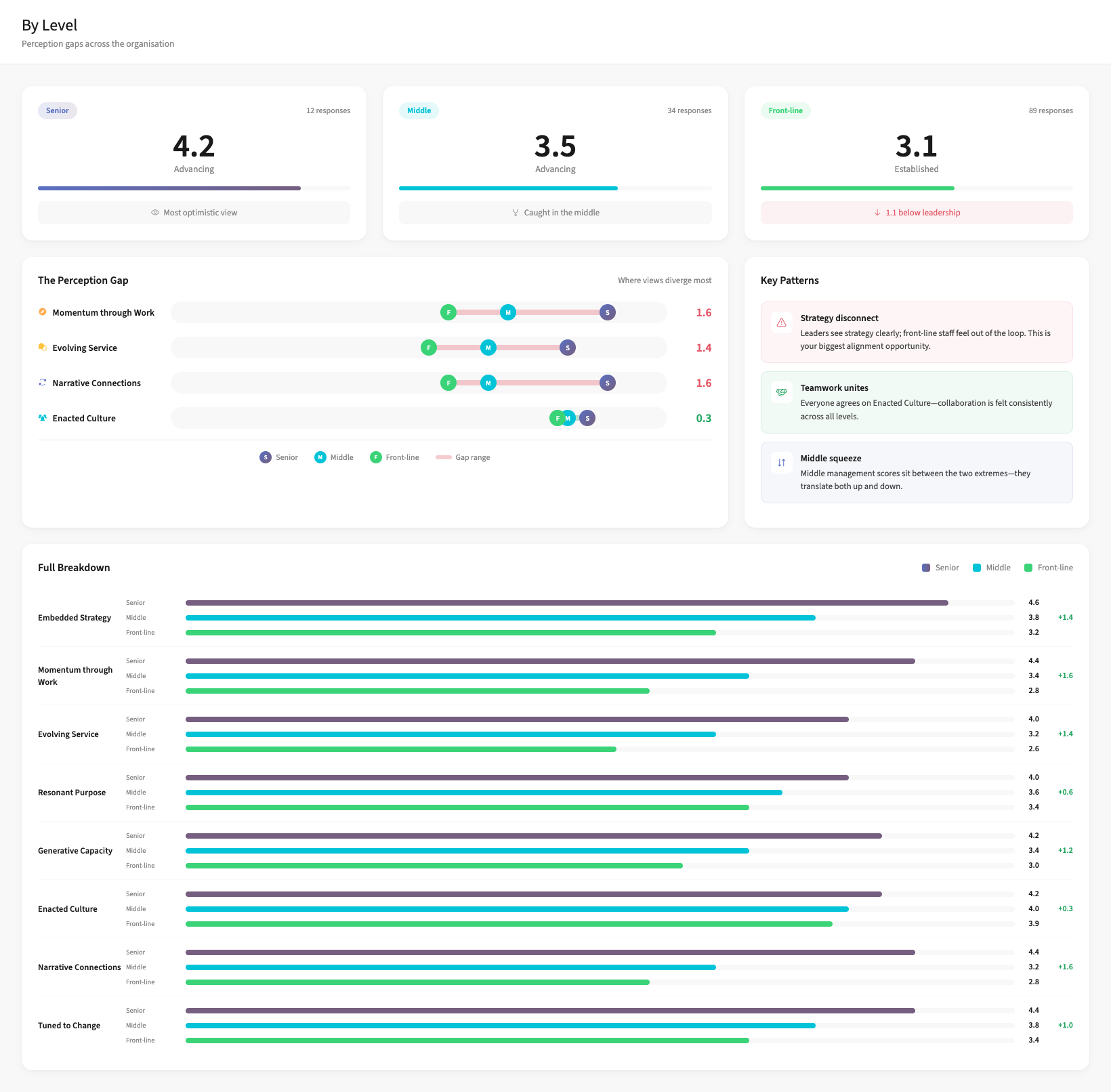 When we measure across levels, patterns emerge that aggregate scores hide. Leadership might see confidence in navigating change. The front line might experience uncertainty. The gap between them tells you something important.