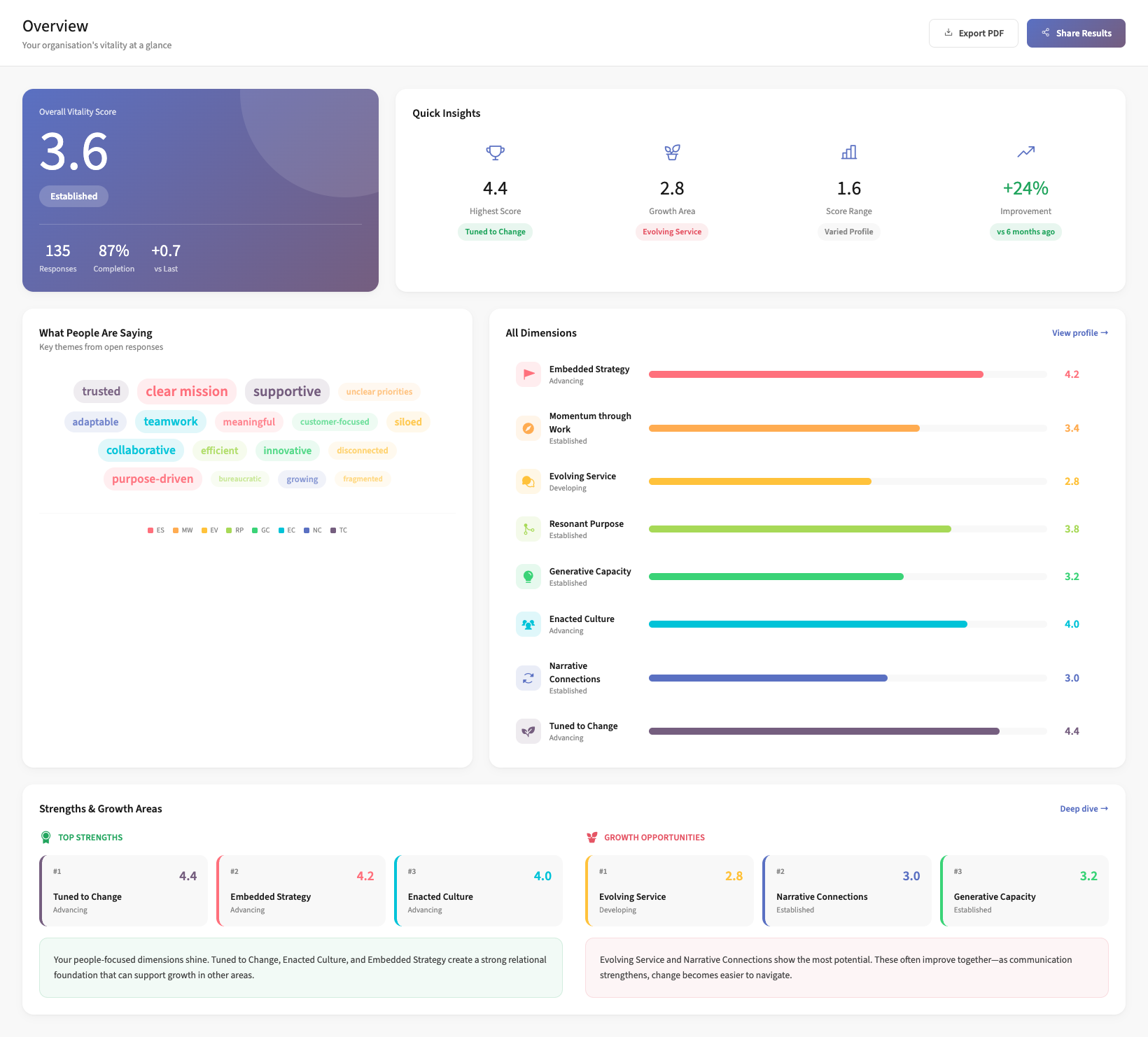 The real insight isn't in individual scores. It's in how things connect: how purpose shapes culture, how strategy enables operations, how change flows (or doesn't) through your organisation.