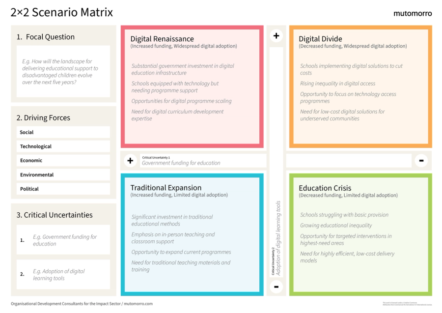 The 2×2 Scenario Matrix is a strategic planning method that helps nonprofit organisations prepare for an uncertain future by exploring multiple plausible scenarios. Unlike forecasting, which attempts to predict a single future, scenario planning acknowledges uncertainty by developing multiple coherent futures and preparing for each.