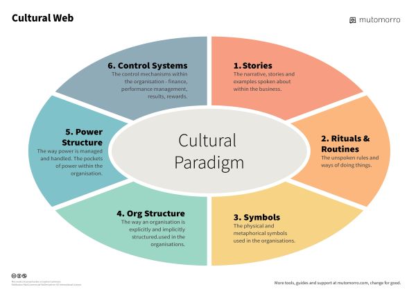 The Cultural Web model is a useful tool in diagnostics and analysis of an organisations existing culture. It can help us understand the interplay between different aspects and how they may affect the culture.