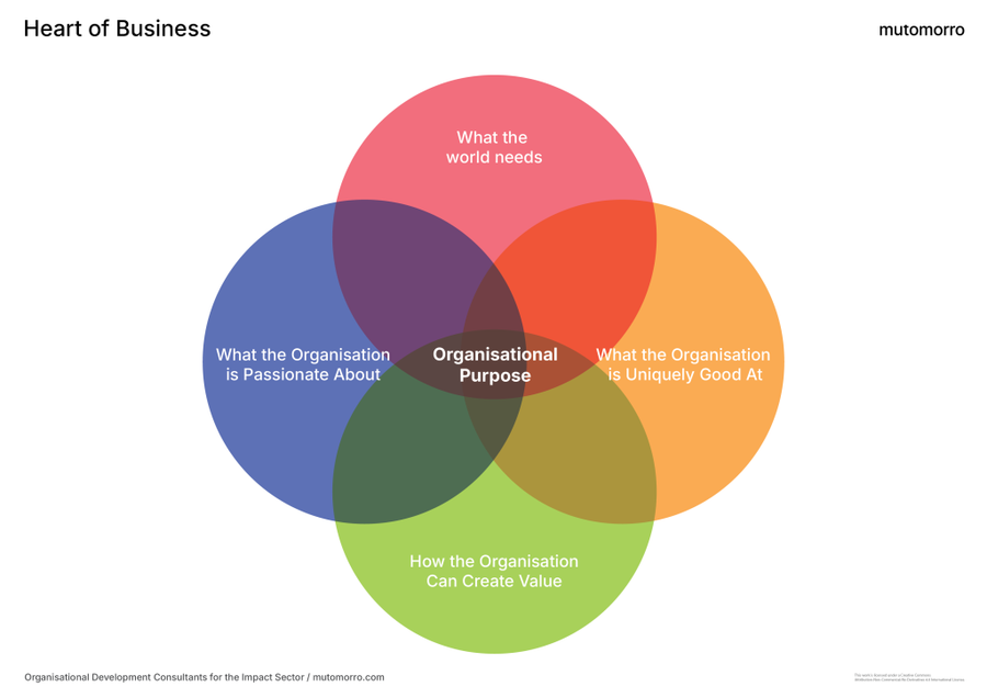 The Westernised (and commercialised) interpretation of Ikigai, loosely borrowed from Japanese culture, represents the intersection of what you love, what you are good at, what the world needs, and what you can be paid for. You'll generally see it as a Venn diagram. It's a framework for finding balance and fulfilment in life and work. The Heart of Business Model takes this model and adapts it to suit an organisational framework. Ikigai's appeal to the organisational development community is its alignment to using purpose to drive strategy and culture. As purpose becomes an increasingly important aspect of why organisations do what they do, so Ikiagai has become a useful framing tool.