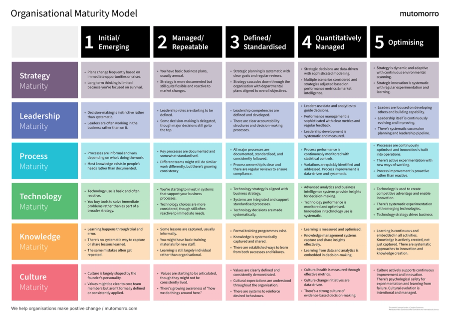 An organisational maturity model refers to how well-developed and sophisticated your company's processes, systems, and capabilities are. Just like people develop from childhood through to adulthood, organisations evolve from operating in ad-hoc, reactive ways to becoming structured, strategic, and continuously improving enterprises.
