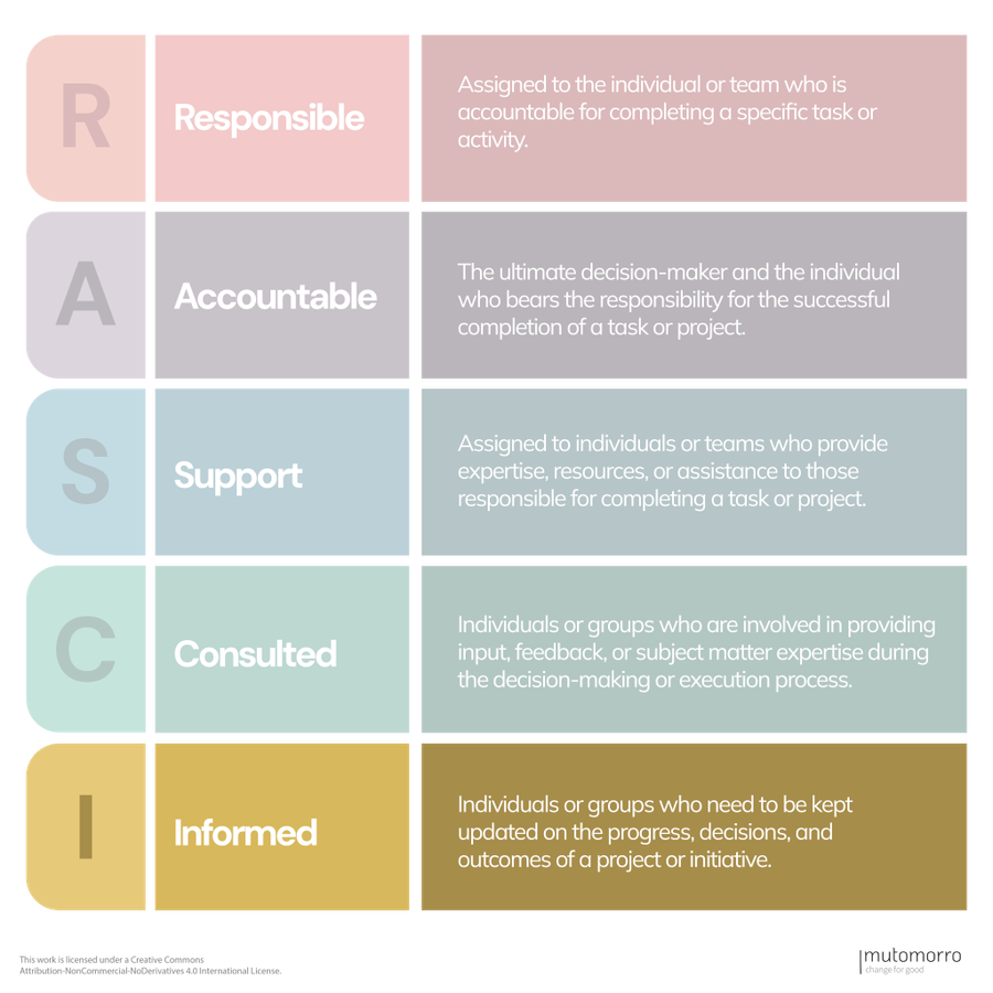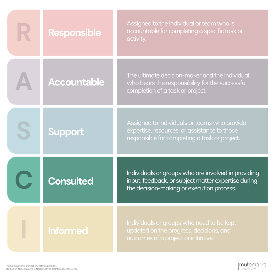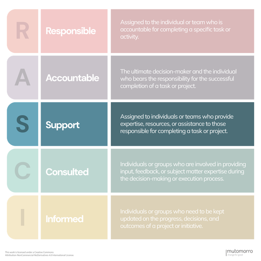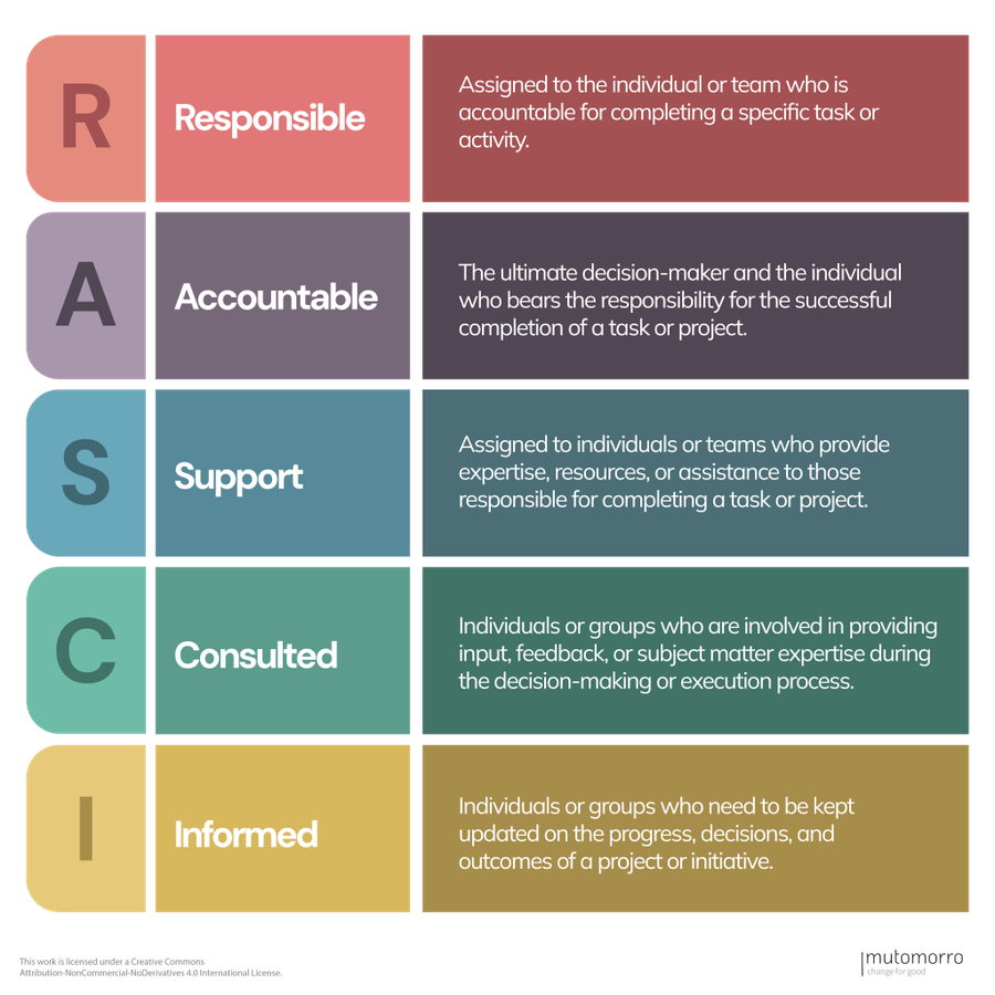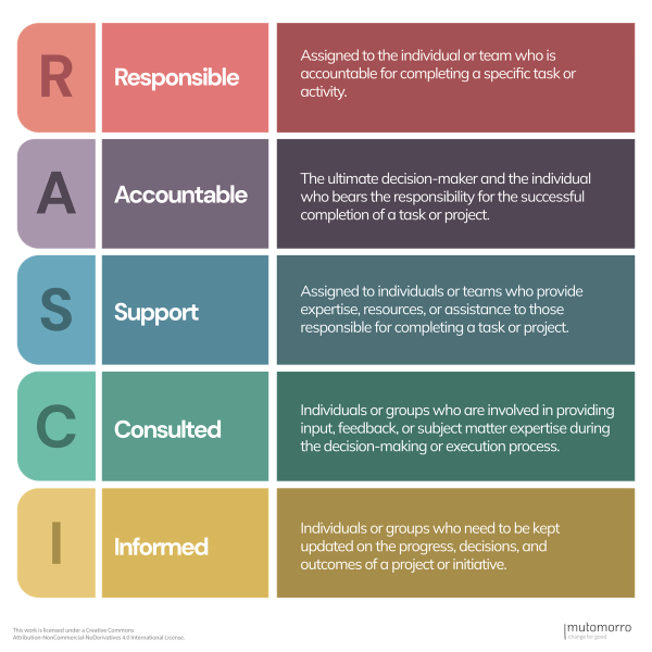 The RASCI framework, an acronym for Responsible, Accountable, Supportive, Consulted, and Informed, is a useful tool that can help organisations streamline decision-making processes and project management. In charities and nonprofits, where projects often involve multiple stakeholders, it's helpful to have a clear understanding of roles and responsibilities. The RASCI framework provides a structured approach to assigning and communicating these roles, ensuring that everyone involved is on the same page.