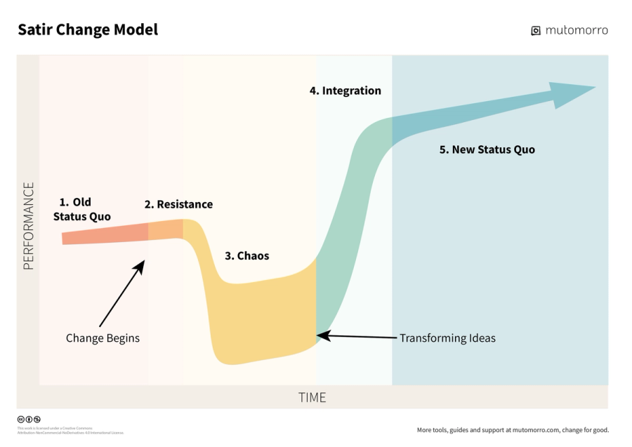 The Satir Change Model maps the emotional journey people go through during change - from stability through resistance and chaos to integration and a new normal. It's especially useful for understanding why performance dips before it improves.